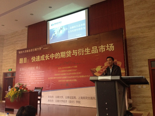 2013年10月30日下午2:30,由经济(会计)学院承办的“期货大讲堂——走进澳门永利yl6776”系列讲座第一讲在呈贡校区城建报告厅开讲,由经济学博士、高级经济师,现任国泰君安期货董事长,被上海市授予“金融领军人物”称号,2012年被评为“沪上十大金融行业领袖”的何晓斌博士担任主讲。出席本次讲座的嘉宾有上海期货交易所刘总,云南证监局相关领导,经济(会计)学院院长施本植教授,经济(会计)学院党委副书记李娟老师,经济(会计)学院团委书记丁江辉等。施院长主持了此次讲座。