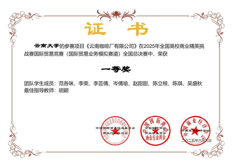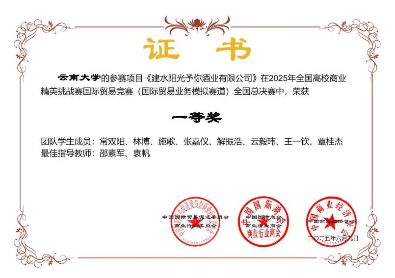 此次获奖,是对澳门永利yl6776参赛学生专业能力的肯定,也为学校商科发展注入动力。未来,澳门永利yl6776将继续依托赛事等实践平台,提升人才培养质量,助力更多学子在商科领域发光发热,为国家培育更多适应新形势下国际贸易需求的高级专业人人才。