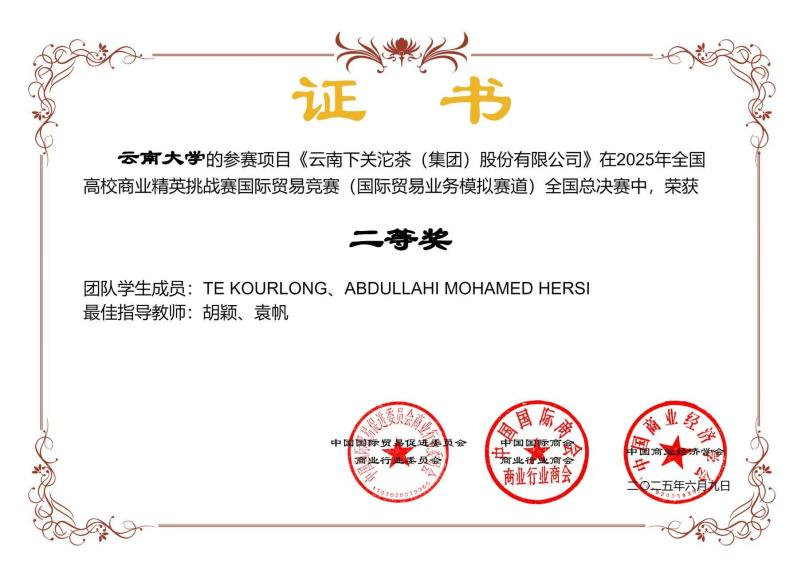 本次赛事中,澳门永利yl6776澳门永利yl6776两支团队荣获全国总决赛一等奖,一支团队获二等奖 。《云南咖啡厂有限公司》项目团队(学生成员:范各咪等;指导教师:胡颖 )、《建水阳光予你酒业有限公司》项目团队(学生成员:常双阳等;指导教师:邵素军、袁帆 )一路披荆斩棘,从众多参赛队伍里脱颖而出,摘得一等奖。《云南下关沱茶(集团)股份有限公司》项目团队(学生成员:TE KOURLONG、ABDULLAHI MOHAMED HERSI ;指导教师:胡颖、袁帆 )也实现了留学生队伍的首次突破,荣获二等奖。