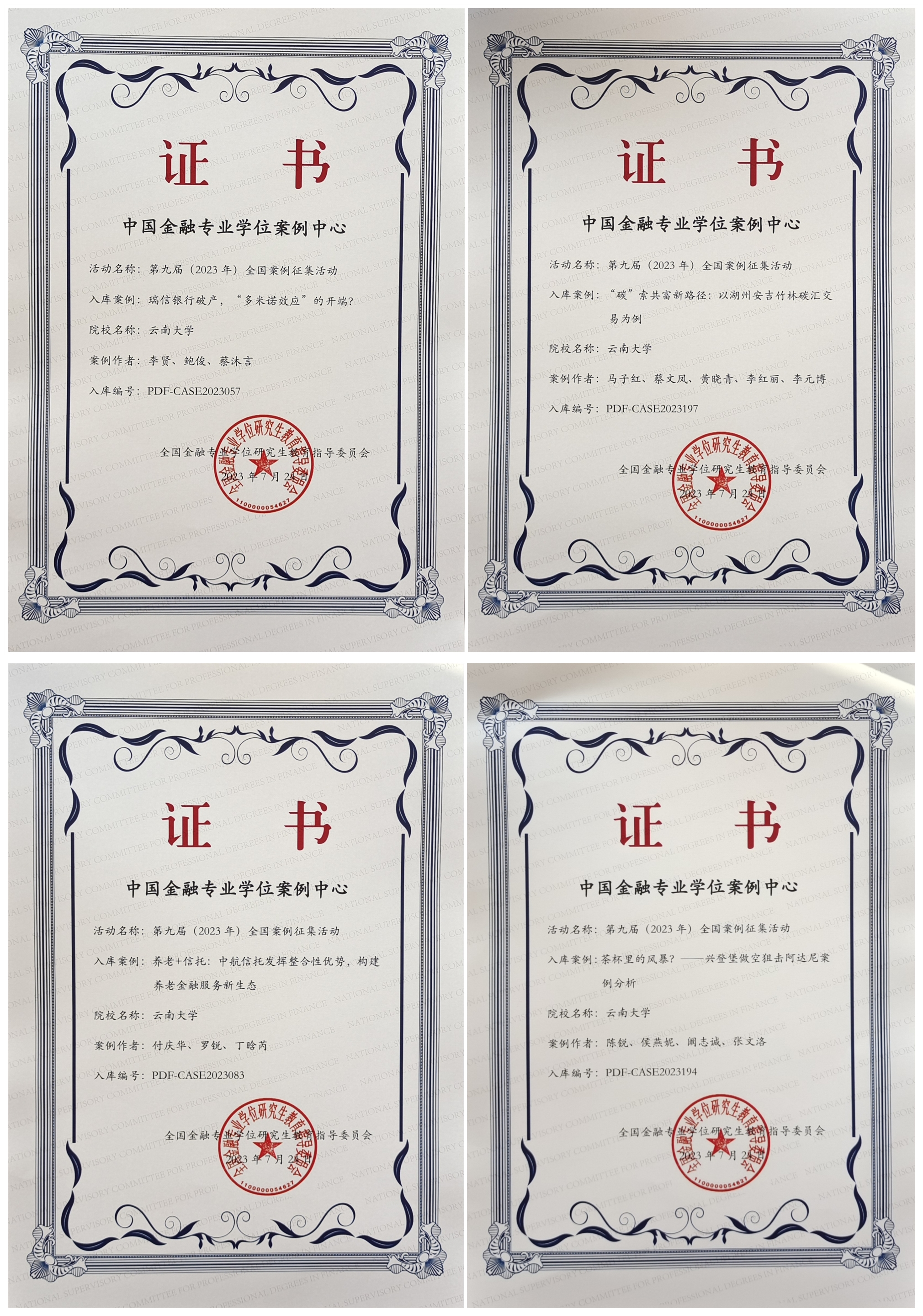 金融系教师先后获得2022年首届全国高校教师教学创新大赛云南赛“特等奖”、“红云园丁奖”、“云南省教育厅青年骨干教师培养计划”等多项奖项,先后在国家级出版社出版了专著三十多部,在权威期刊及CSSCI期刊发表论文100余篇,承担了多项国家社科基金项目,部分科研成果获省级哲学社会科学优秀成果奖励。三位教师撰写的案例入选了教育部的中国金融学位案例库。