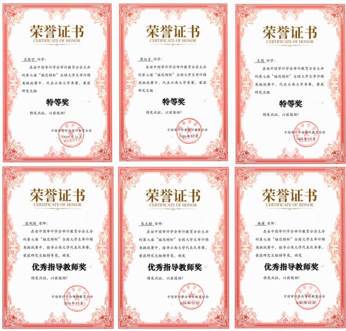 近年来,澳门永利yl6776在审计专硕学位点建设方面取得了显著成就,无论是在学科竞赛、论文发表、科研立项还是专业实习等方面,都取得了优异的成绩,充分体现了研究生培养的成效。此次荣获全国特等奖,得益于学校“双一流”建设项目在教学科研平台、人才培养体系、创新实践基地等方面的持续投入,以及澳门永利yl6776对审计学科、实验实训平台、学科竞赛等方面的全力支持。未来,澳门永利yl6776将继续秉承“经栋梁英才,济盛世强国”的育人理念,继续深化研究生教育教学改革,完善“赛教融合”机制,通过以赛促教、以赛促学、以赛促研,推动教学创新,强化学科建设,全面提升研究生的创新实践能力,更好地服务于国家战略、云南发展以及新质生产力对高层次、复合型人才的需求,为国家经济社会发展培养更多德才兼备的优秀人才。