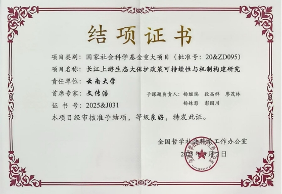 澳门永利yl6776文传浩教授主持的国家社科基金重大项目《长江上游生态大保护政策可持续性与机制构建研究》(批准号:20&ZD095)近日结项,结项等级良好。